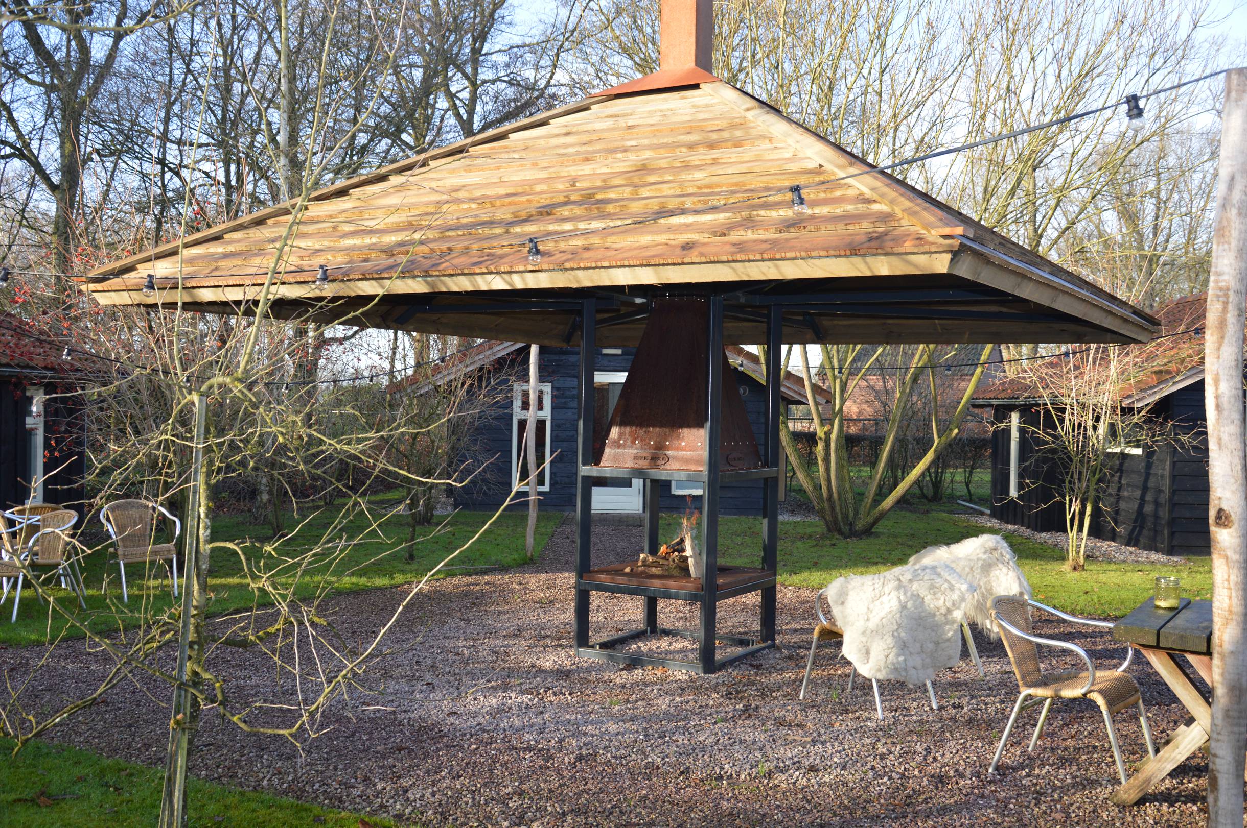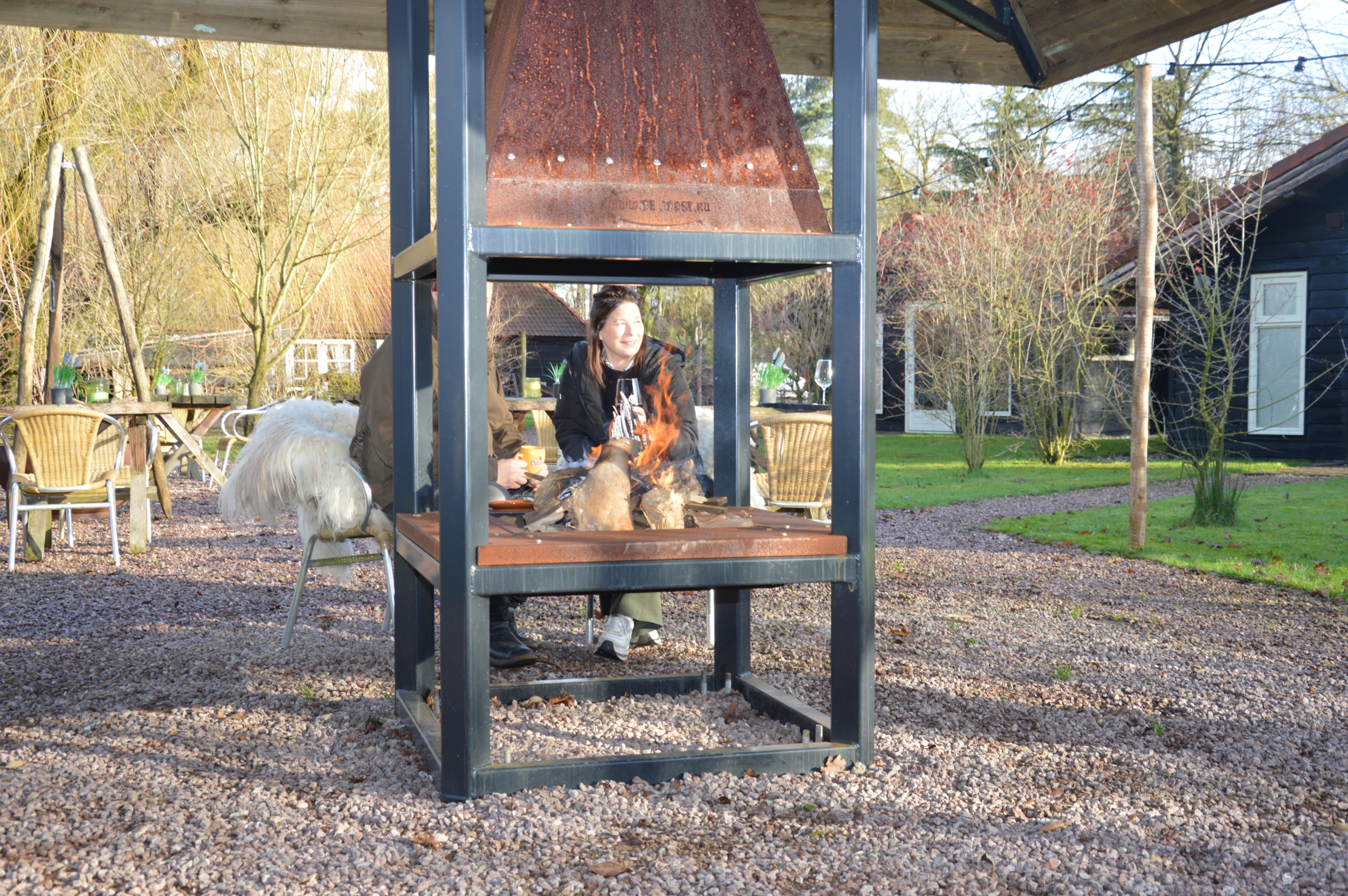 De vuurhaard met luifel van DE JOOST is gemaakt om mensen samen te brengen. Het robuuste cortenstaal straalt warmte en karakter uit, terwijl de gepoedercoate luifel als een stijlvolle hoed boven de haard hangt. Het resultaat is een blikvanger die elke locatie direct meer sfeer geeft. Zelfs op frisse avonden blijft het gezellig rondom het vuur; tientallen gasten kunnen zonder moeite rond de haard staan en genieten van die vertrouwde gloed. De dakconstructie is volledig aanpasbaar aan de stijl van jouw terrein of terras. Van landelijk tot modern, van stoer tot ingetogen; de luifel past altijd naadloos in de omgeving.