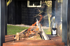 - Uniek ontwerp; cortenstalen haard met gepoedercoate luifel, nergens anders in deze vorm te vinden.