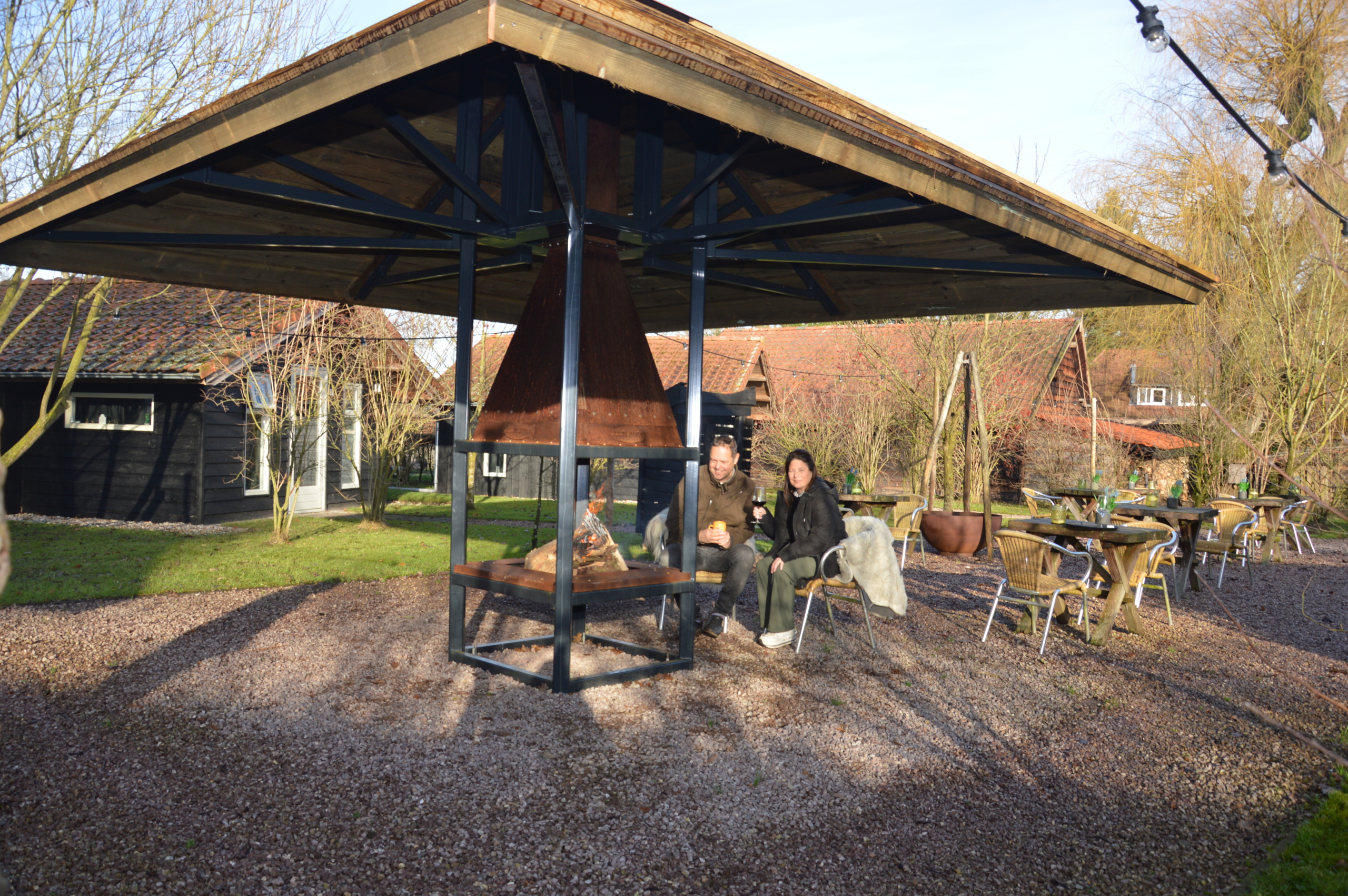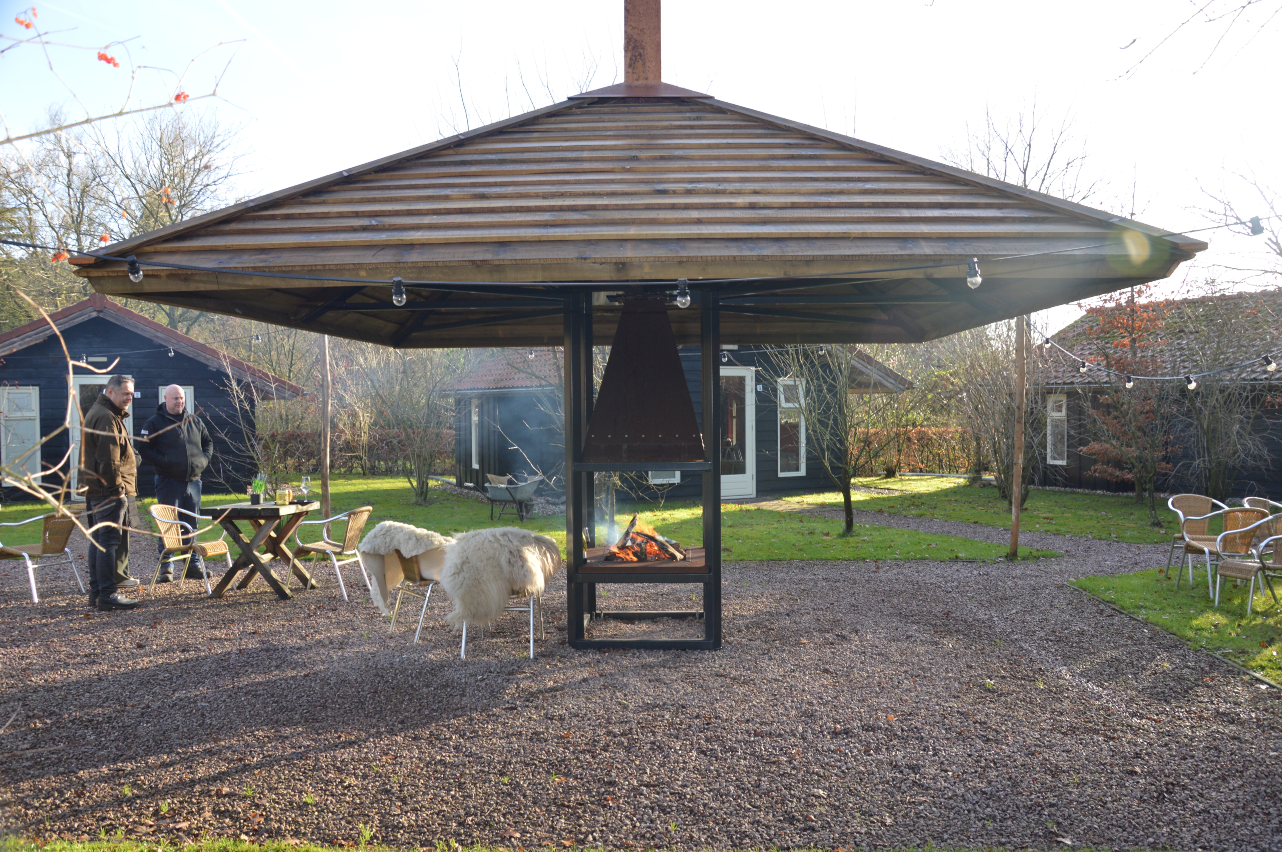 De luifel houdt de warmte bij de groep, het vuur knettert als een natuurlijke magnet. Het is geen losse vuurplaats, maar een ontmoetingsplek waar iedereen instinctief samenkomt. En terwijl de avond frisser wordt, blijft de kring groeien