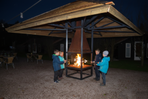 De avond valt langzaam over de camping. Tentlampjes floepen aan, kinderen rennen nog met roodverbrande neuzen over het veld en de lucht krijgt dat blauwe tintje dat alleen zomeravonden hebben. Midden op het terrein begint de vuurhaard met luifel zachtjes te gloeien. Eerst komen er twee kinderen nieuwsgierig naartoe, een zak marshmallows stevig in de hand. Dan sluiten er meer aan. Binnen een paar minuten staat er een volle kring; vaders die het perfecte stokje zoeken, moeders die lachen om half verbrande schuimpjes en kinderen die elkaar leren hoe je een marshmallow precies goudbruin krijgt.